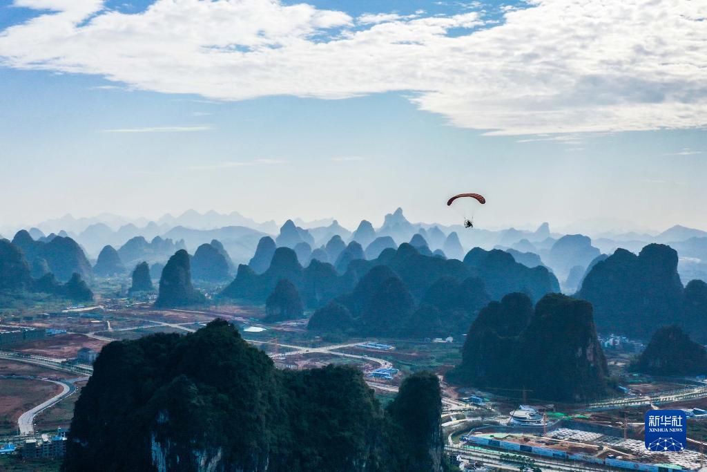游客在广西桂林市阳朔县体验动力滑翔伞(2019年11月14日摄,无人机照片)。新华社记者 曹祎铭 摄