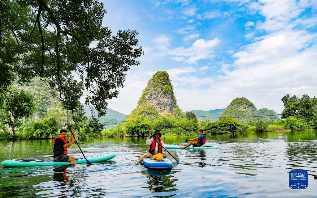 9月6日,游客在广西桂林市阳朔县划桨板。新华社记者 胡星宇 摄
