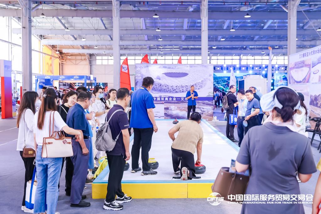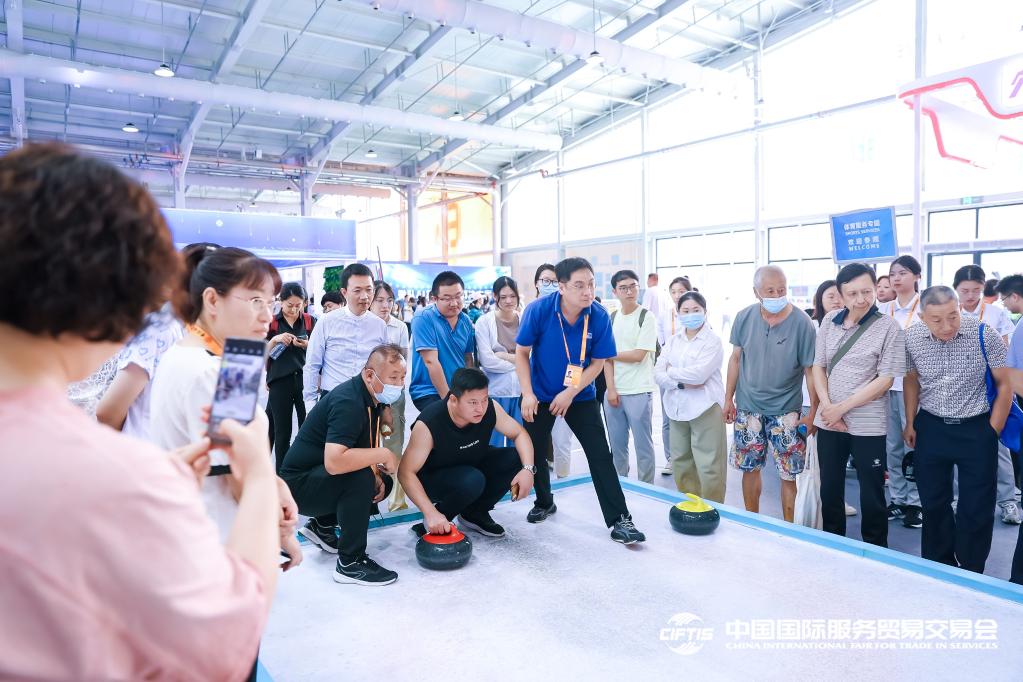 前来参观的市民在工作人员指导下体验冰壶运动。主办方供图