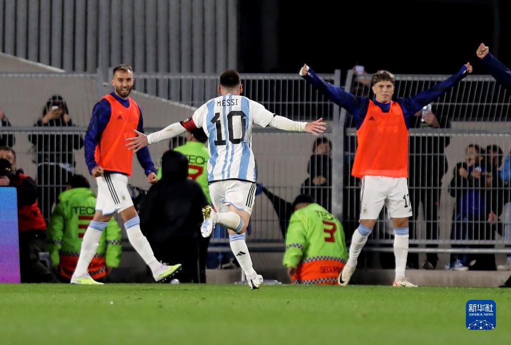 9月7日,阿根廷队球员梅西(上)进球后与队友庆祝。新华社发(马丁·萨巴拉摄)