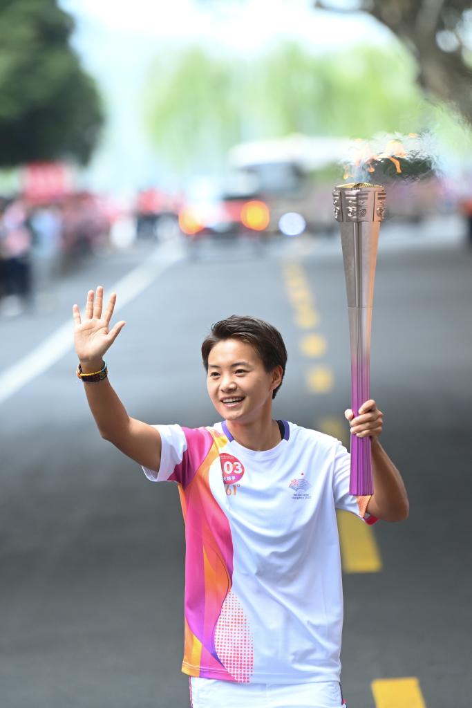 新华社杭州9月8日电 杭州亚运会火炬传递8日启动。西子湖畔,在“亚运加油”“女足加油”“王霜加油”的欢呼声中,第103棒火炬手、中国女足国脚王霜高举火炬“薪火”,帅气起跑,还不忘深情亲吻右手手腕上的彩色手环。
