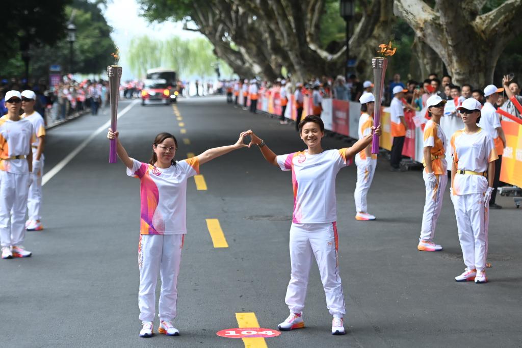 这份珍重,让王霜直到火炬传递启动仪式前一小时,才最终确定传递火炬时的定格姿势。引燃火炬后,王霜和上一棒火炬手以“弯弓射大雕”之姿高举火炬,“如同射箭一般,将亚运火种和亚运精神传递出去”。王霜与第104棒火炬手、“最美妈妈”吴菊萍交接后,她们各伸出一只手,合力比出一颗爱心的形状。
