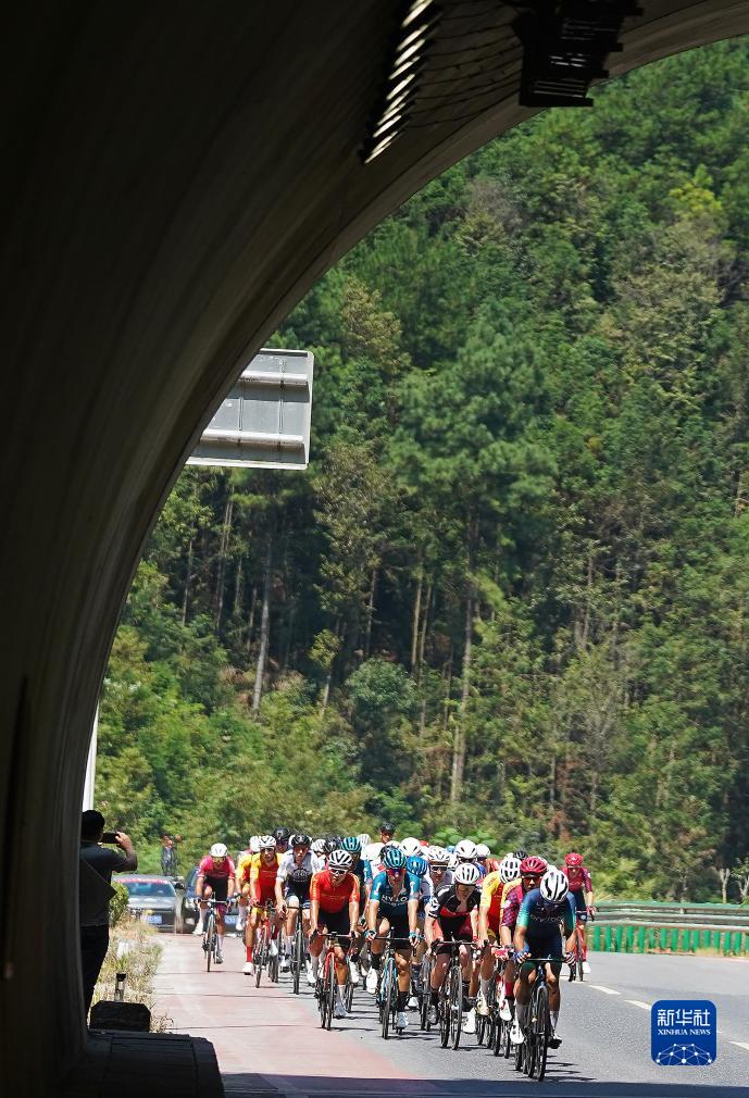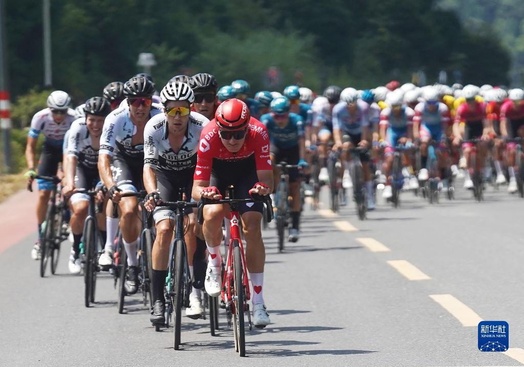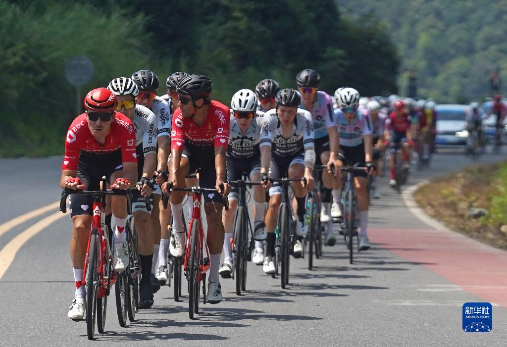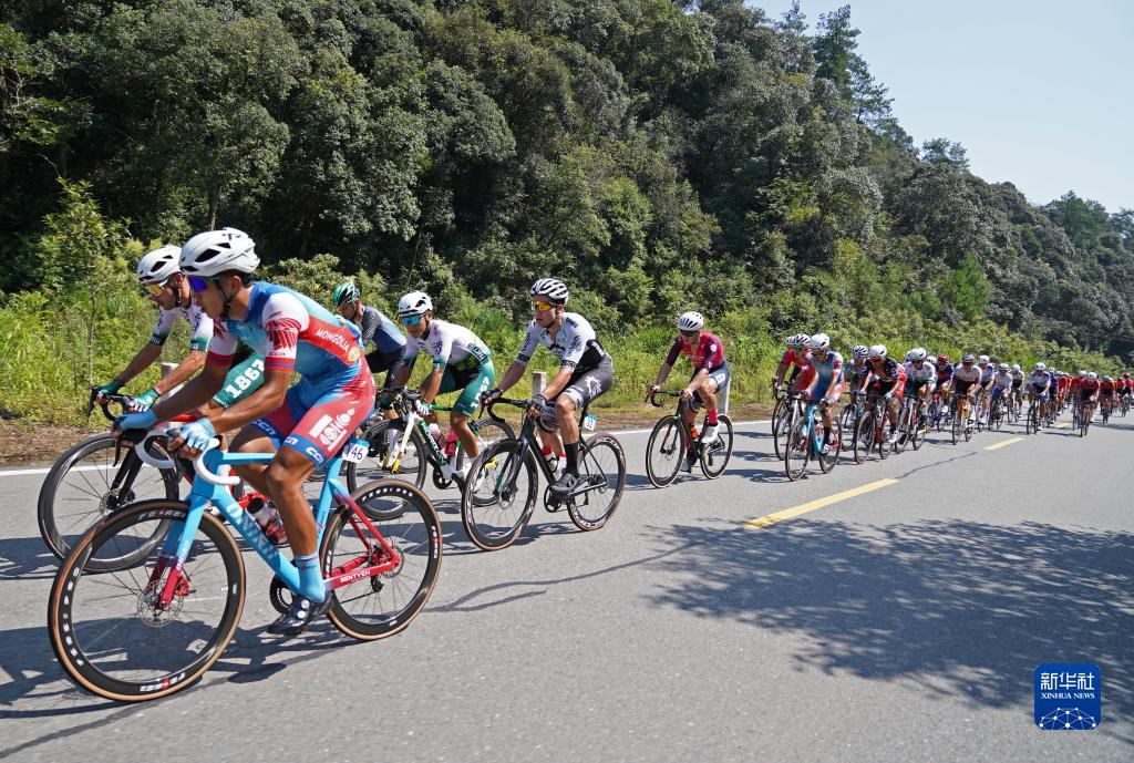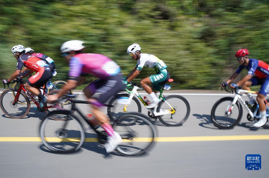 9月8日,中国华兴洲际车队车手吕先景(前)率先冲过终点,获得该赛段冠军。新华社记者 万象 摄
