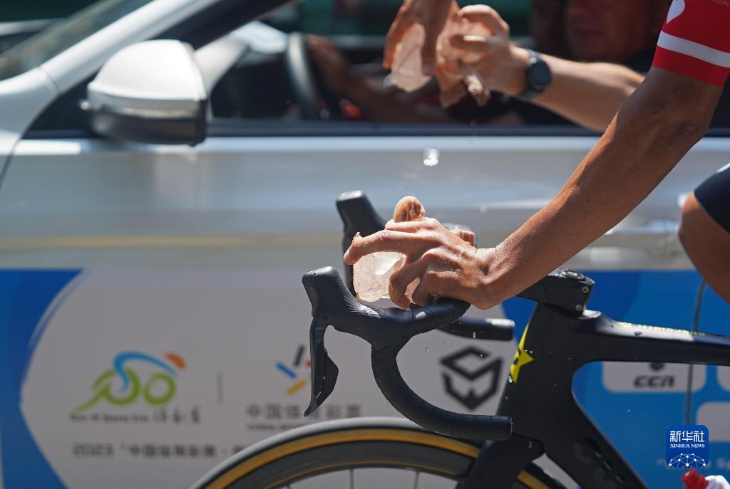 9月8日,波兰车手诺伯特·巴纳谢克在比赛中用冰块降温。新华社记者 万象 摄