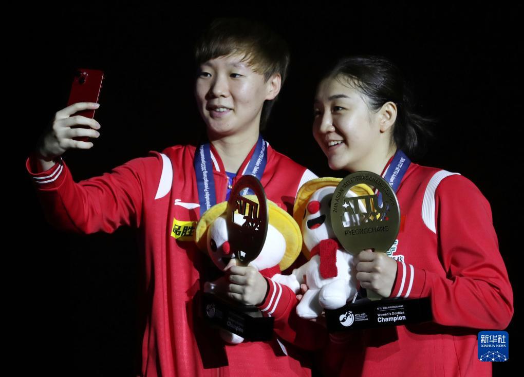 9月10日,王曼昱/陈梦(右)在颁奖仪式上自拍留念。新华社发(李相浩摄)