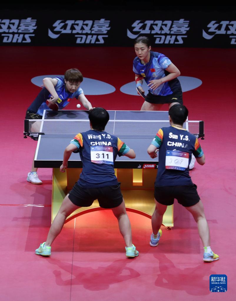 9月10日,孙颖莎/王艺迪(左)在比赛中。新华社发(李相浩摄)