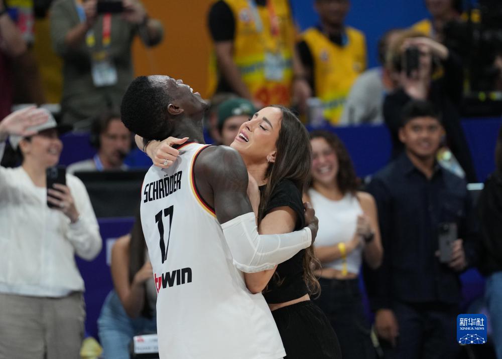 9月10日,德国队球员丹尼斯·施罗德(左)赛后与妻子拥抱庆祝。新华社记者 孟永民 摄