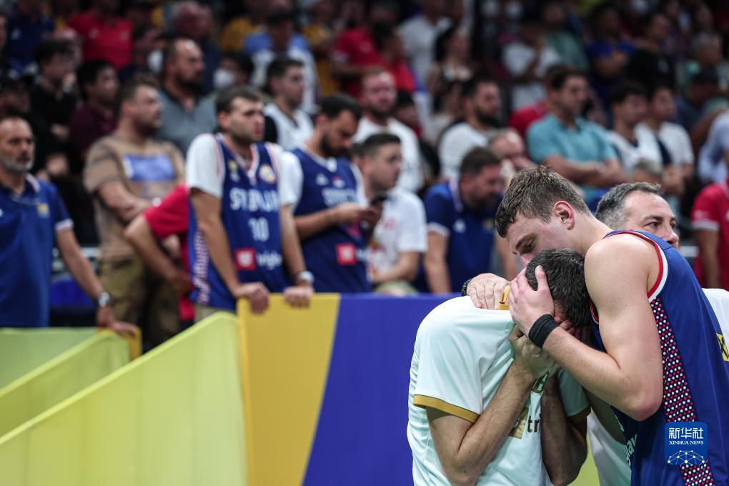 9月10日,塞尔维亚队球员博格丹·博格达诺维奇(右)在比赛中安慰队友。新华社记者 孟永民 摄