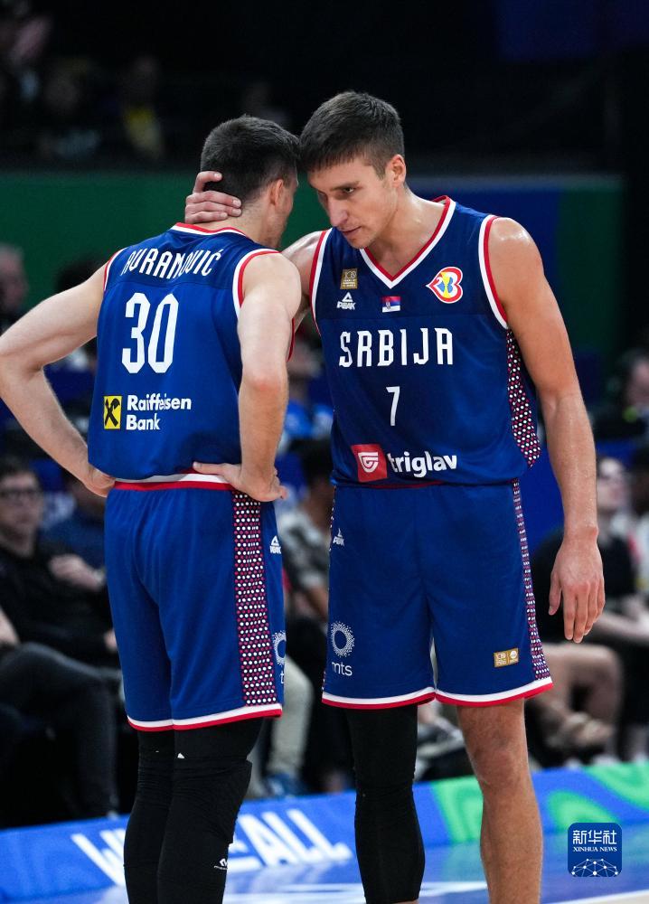 9月10日,塞尔维亚队球员博格丹·博格达诺维奇(左)在比赛开始前热身。新华社记者 孟永民 摄