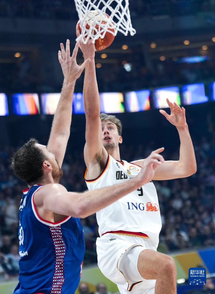 9月10日,塞尔维亚队球员德扬·达维多瓦茨(右下)与德国队球员莫里茨·瓦格纳(左下)在比赛中投篮。新华社记者 吴壮 摄