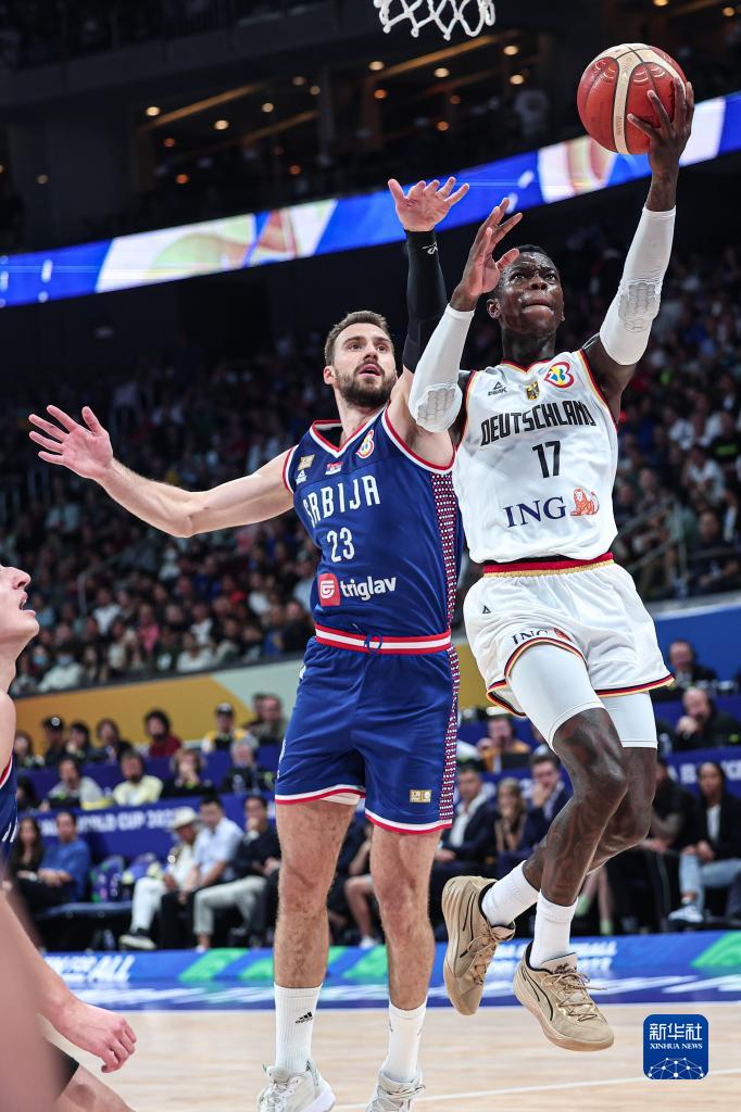 9月10日,德国队球员丹尼斯·施罗德(右)在比赛中上篮。新华社记者 吴壮 摄