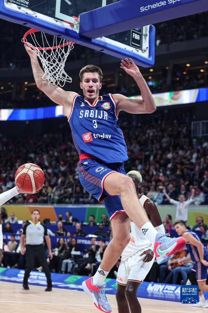 9月10日,塞尔维亚队球员菲利普·彼得鲁舍夫(上)在比赛中扣篮。新华社记者 吴壮 摄
