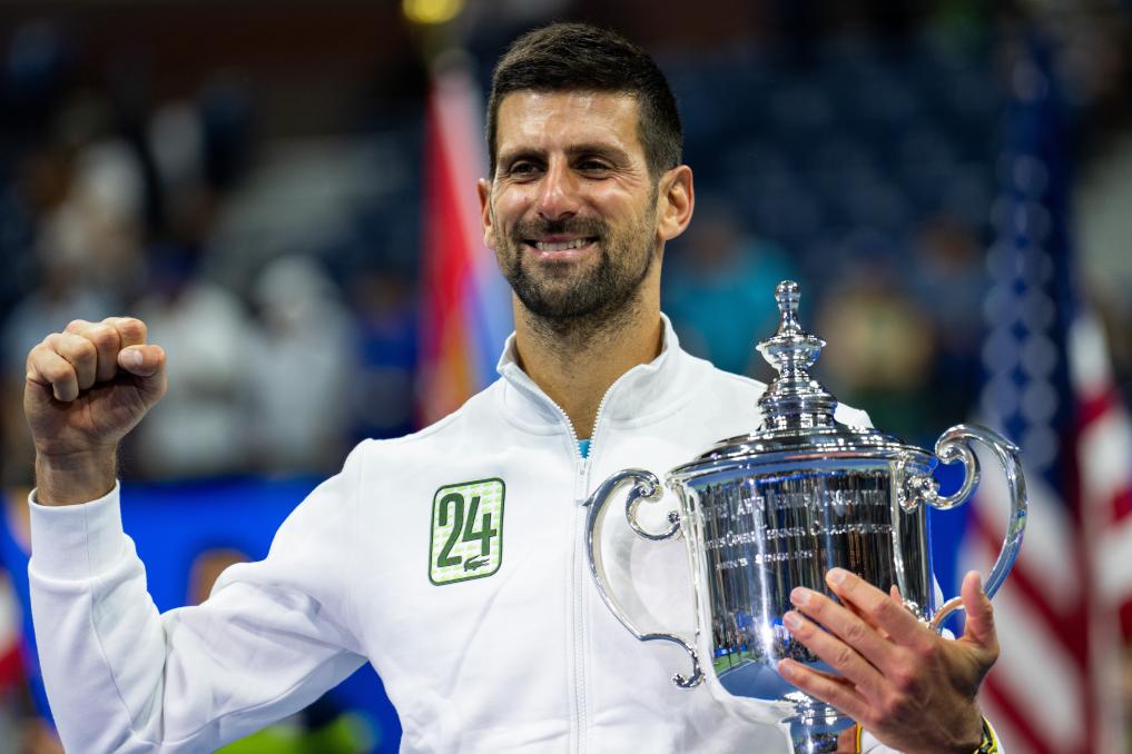 9月10日,焦科维奇在颁奖仪式上庆祝。当日,在纽约进行的2023美国网球公开赛男单决赛中,塞尔维亚选手焦科维奇以3:0战胜俄罗斯选手梅德韦杰夫,获得冠军。新华社记者刘杰摄