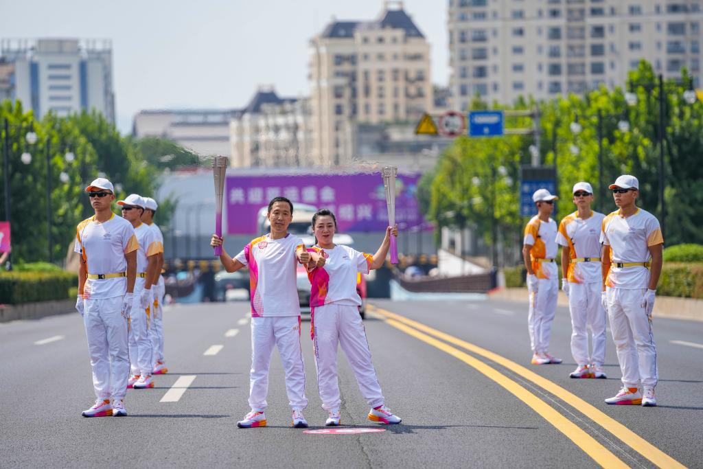 9月11日,火炬手单杰(左)和张迪在火炬传递中。新华社记者 孙非 摄