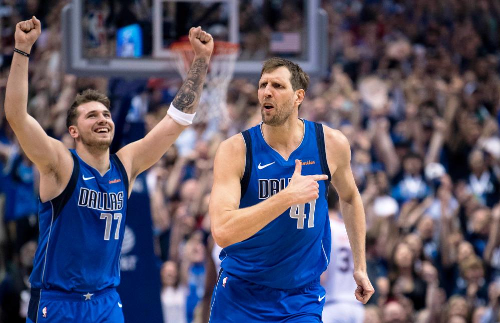 2019年4月9日,独行侠队球员诺维茨基(右)在比赛中庆祝。新华社/路透