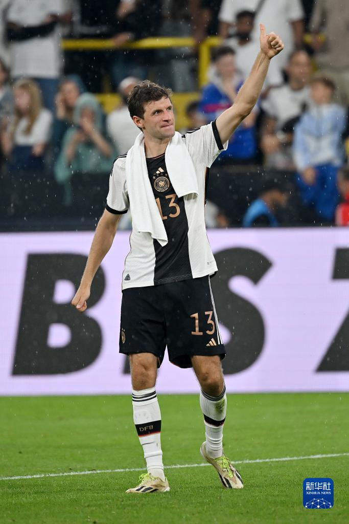 9月12日,德国队球员托马斯·穆勒向现场观众致意。新华社发(乌尔里希·胡夫纳格尔 摄)