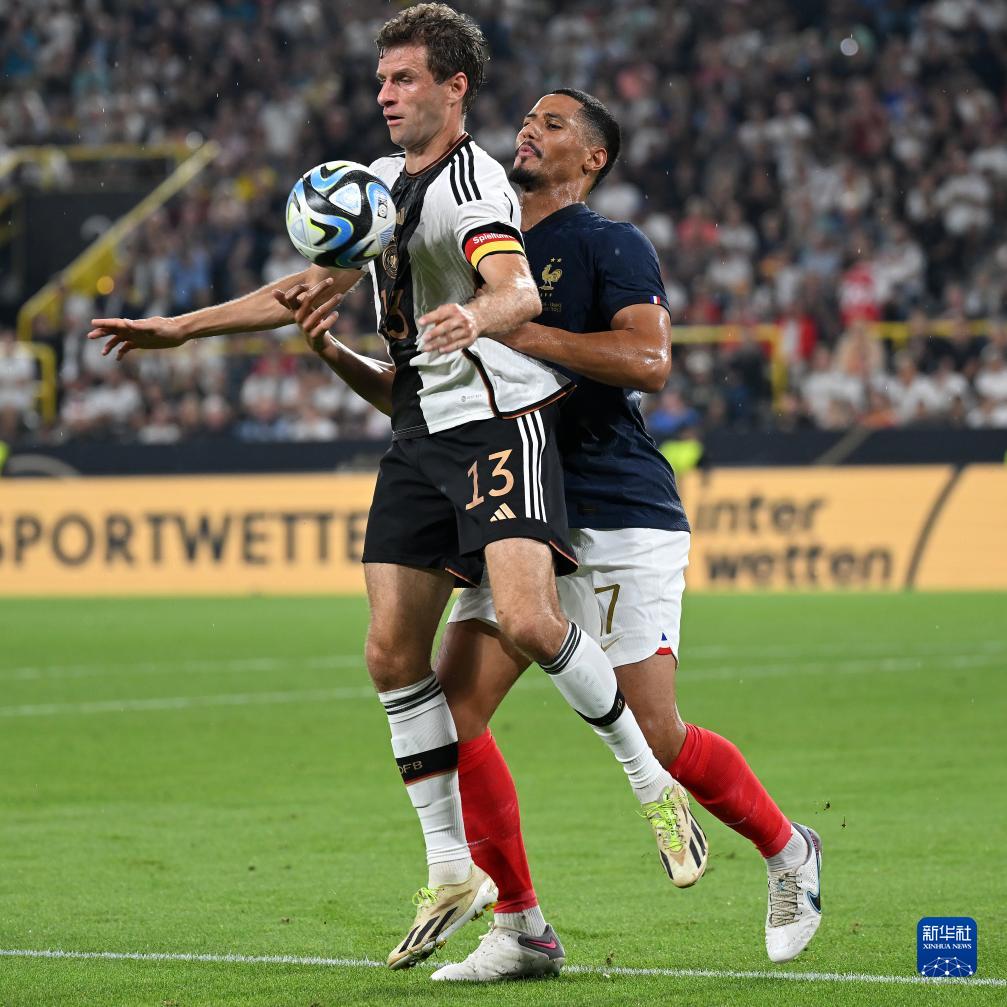 9月12日,德国队球员托马斯·穆勒(左)与法国队球员萨利巴在比赛中拼抢。新华社发(乌尔里希·胡夫纳格尔 摄)