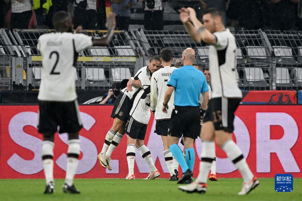 9月12日,德国队球员萨内(后左)庆祝本队第二粒进球。新华社发(乌尔里希·胡夫纳格尔 摄)