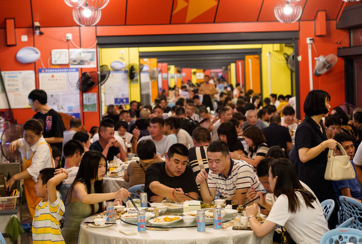 游客在嵊泗县黄龙乡峙岙村一个临海而建的民宿餐厅内休憩。