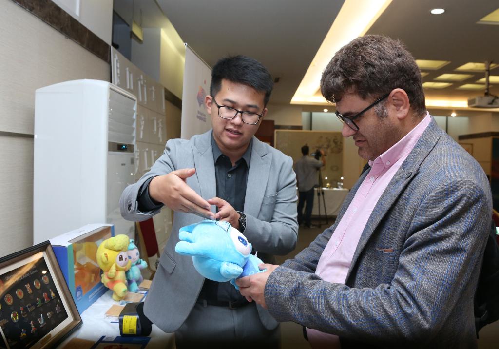 9月11日,在伊朗首都德黑兰的中国驻伊朗大使馆多功能厅,工作人员介绍杭州亚运会吉祥物。新华社记者沙达提摄