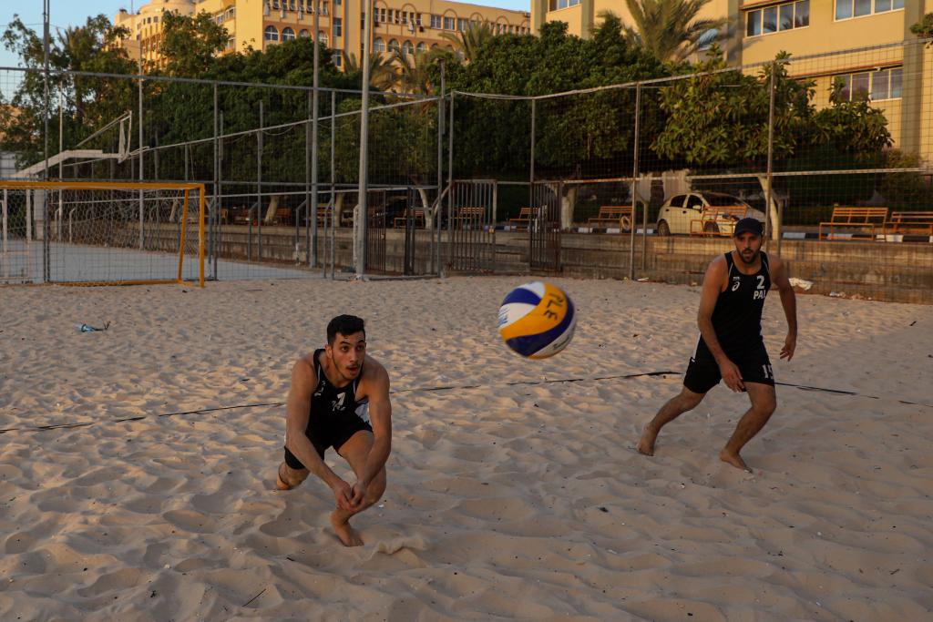 8月7日,巴勒斯坦沙滩排球运动员阿卜杜拉·阿尔坎(左)和他的搭档易卜拉欣·卡西亚在加沙城训练。新华社发(里泽克·阿卜杜勒贾瓦德摄)