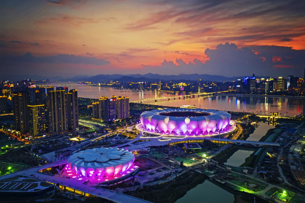 ↑杭州奥体中心场馆群。新华社发(杭州亚组委供图)