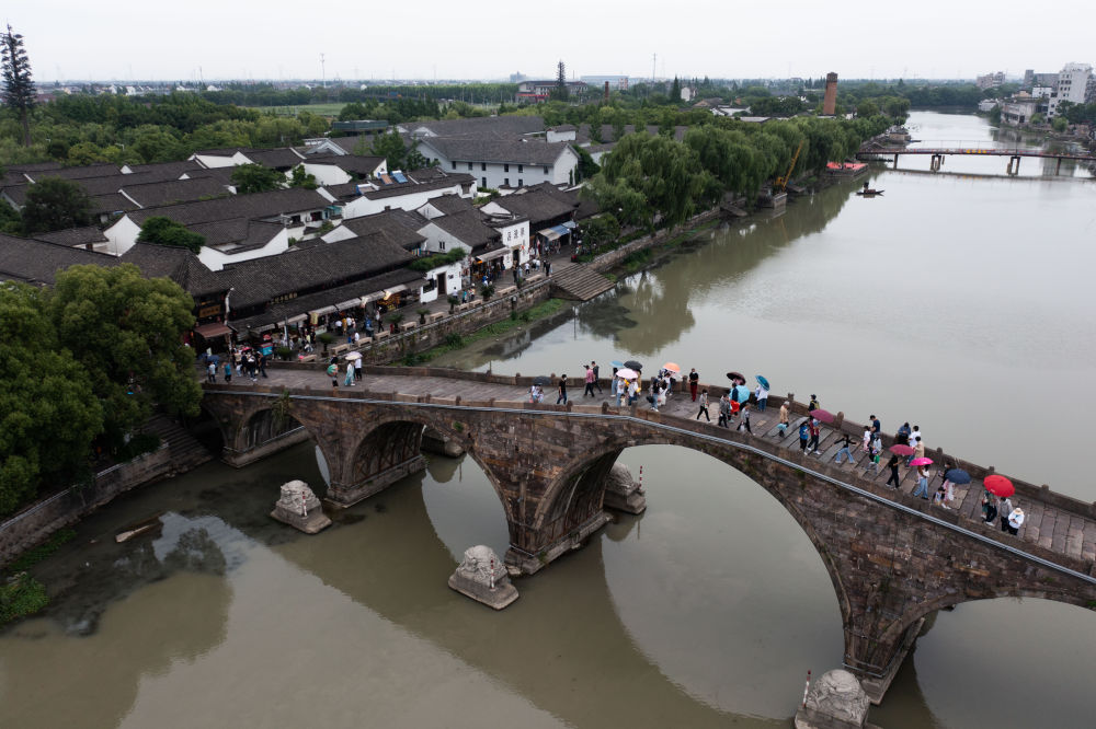 ↑游人在京杭大运河旁的塘栖古镇游玩。