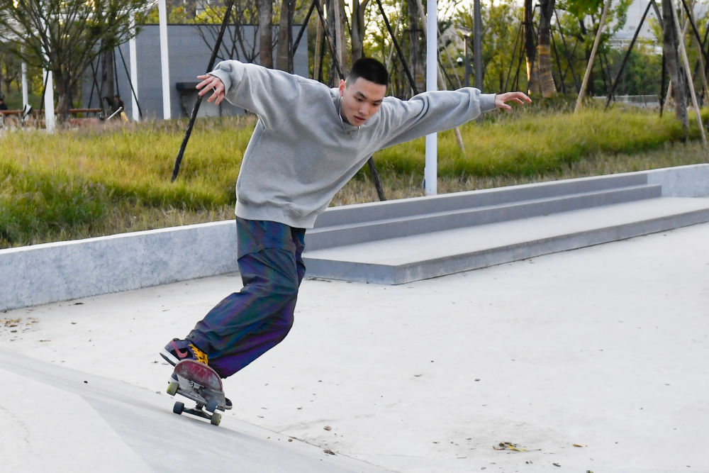 ↑市民在大运河亚运公园里的滑板公园练习滑板。