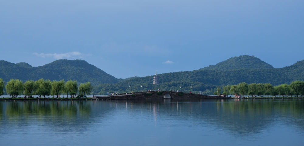 ↑夏日晨曦中的杭州西湖景区。