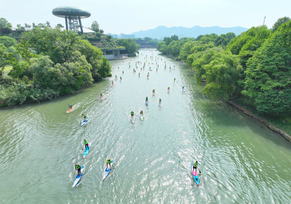 ↑运动员在西溪湿地参加桨板比赛。
