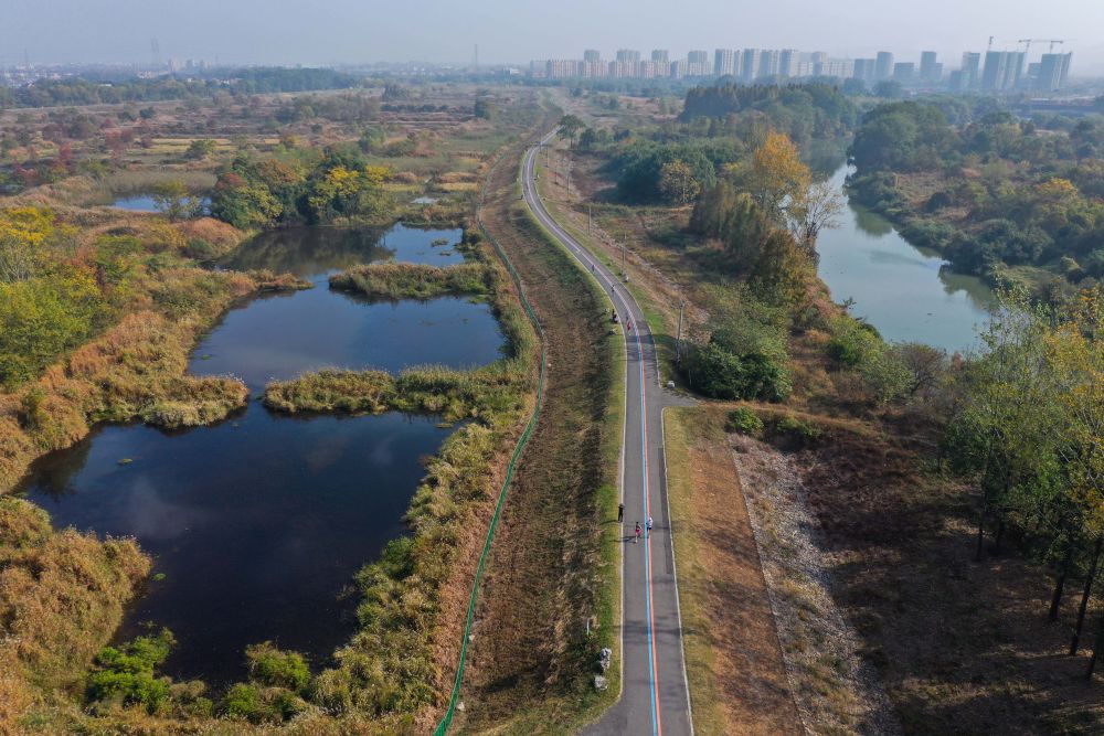 ↑杭州市余杭区瓶窑镇北湖草荡生态湿地的健身游步道。