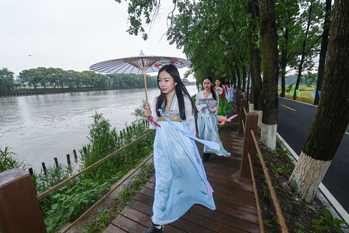 ↑身穿传统服饰的市民在在京杭大运河杭州临平段大运河绿道参加全民健身健步走活动。