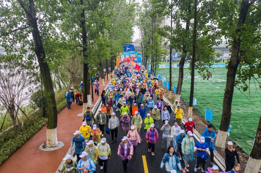 ↑市民在京杭大运河杭州临平段大运河绿道参加全民健身健步走活动。