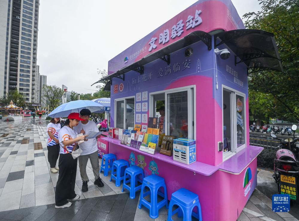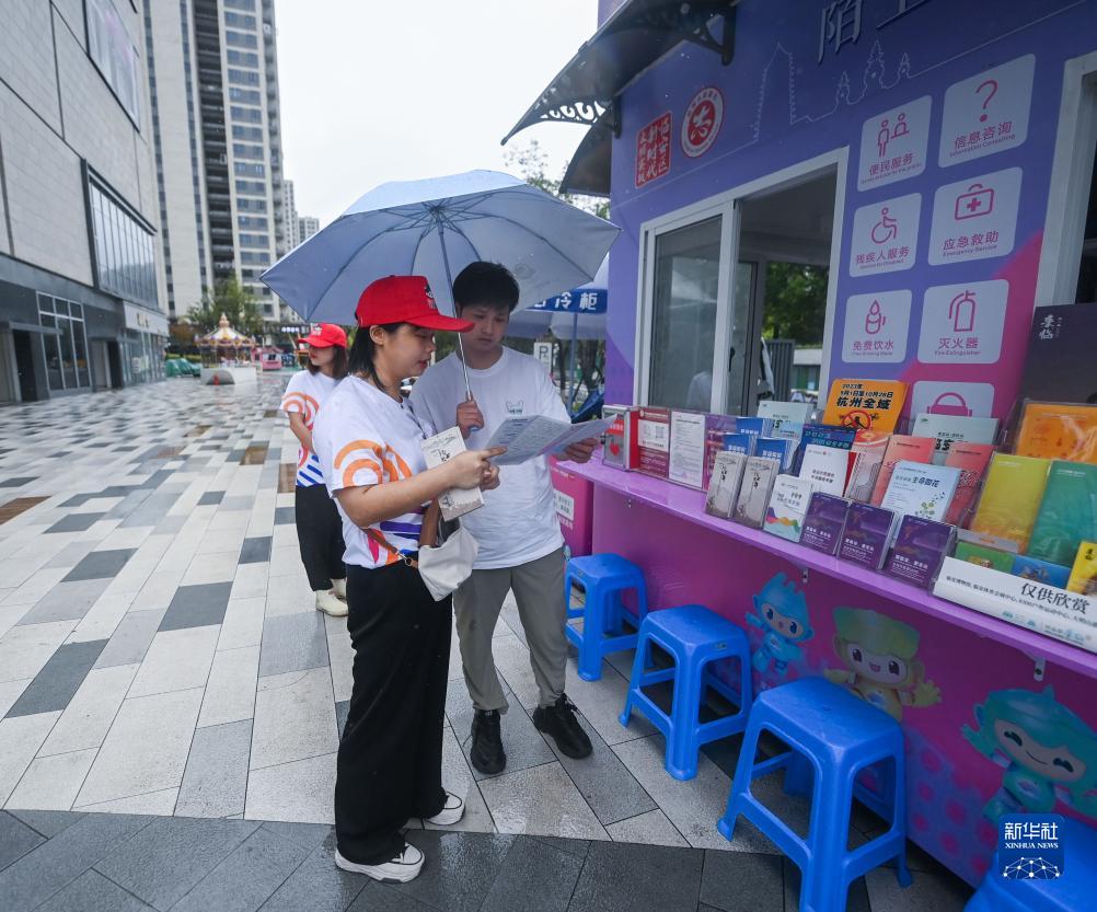 9月15日,志愿者在临安体育文化会展中心体育馆旁的亚运城市志愿服务文明驿站工作。新华社记者 徐昱 摄