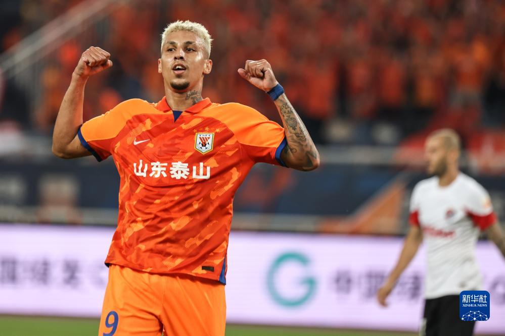 9月15日,山东泰山队球员克雷桑·巴塞洛斯庆祝进球。新华社记者 朱峥 摄