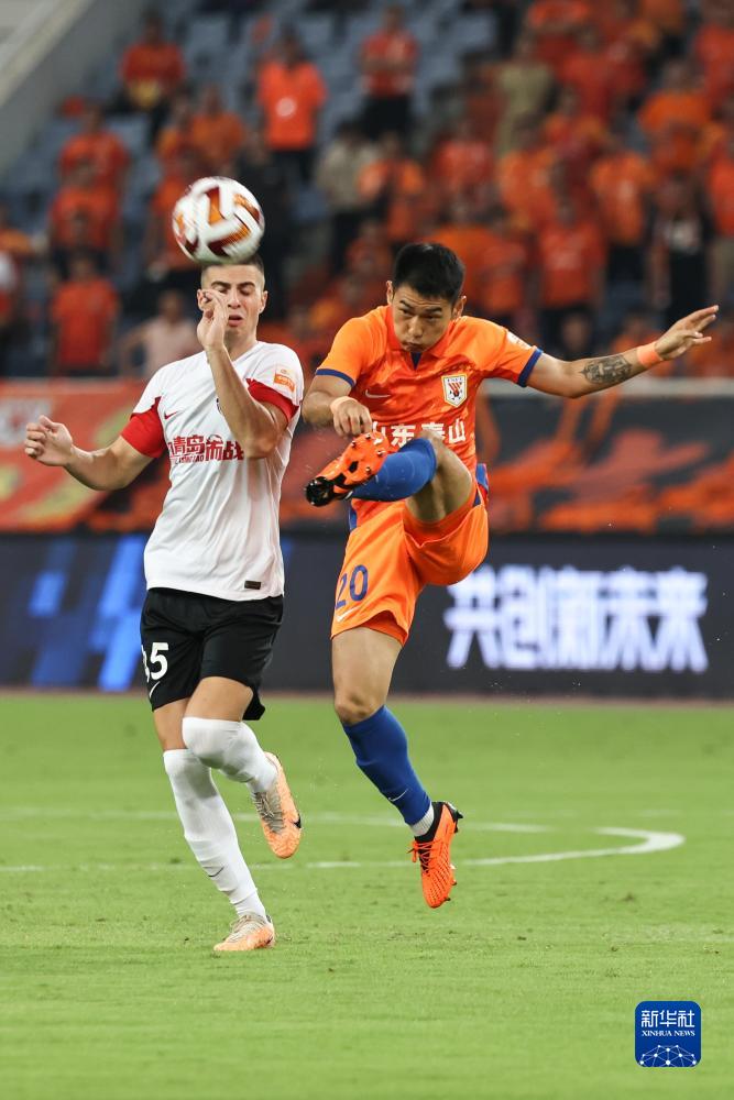 9月15日,山东泰山队球员廖力生(右)与青岛海牛队球员沙里奇在比赛中拼抢。新华社记者 朱峥 摄
