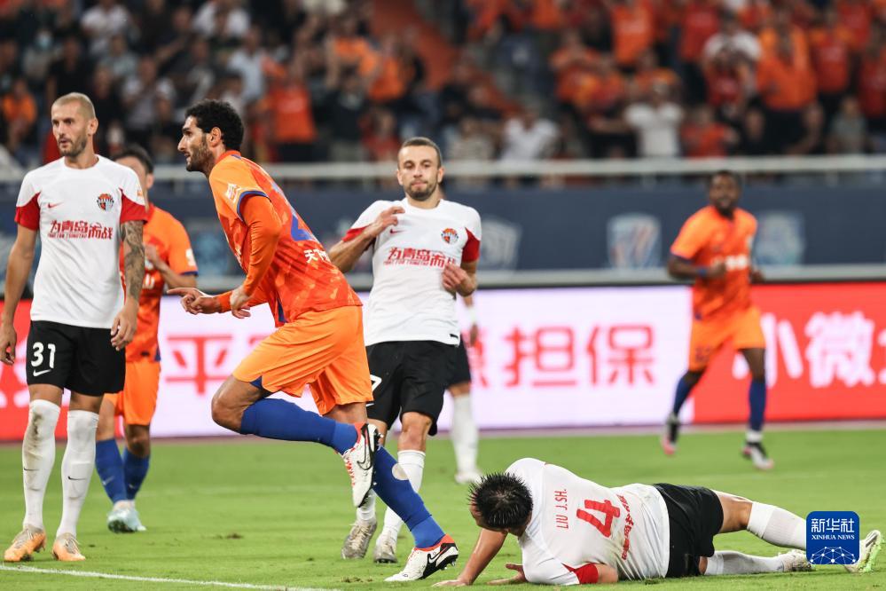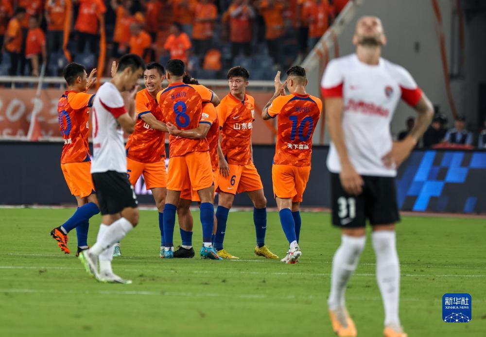 9月15日,山东泰山队球员在比赛中庆祝进球。新华社记者 朱峥 摄