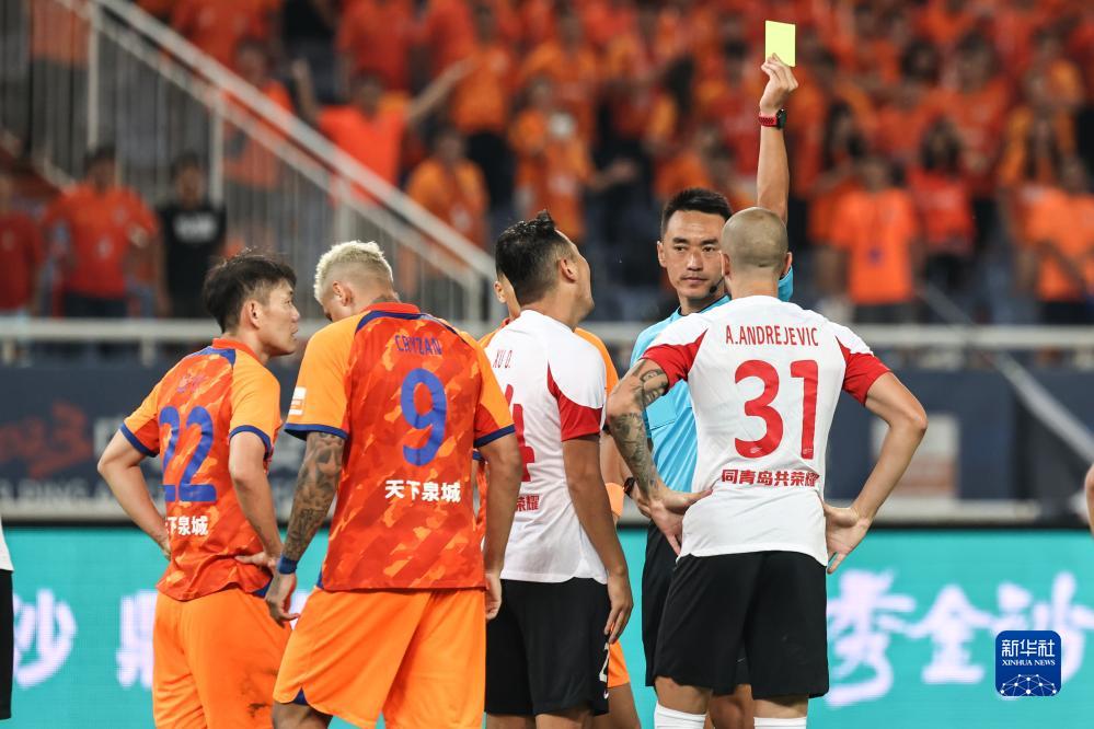 9月15日,主裁判杜健鑫向青岛海牛队球员安德烈(右一)出示黄牌。新华社记者 朱峥 摄