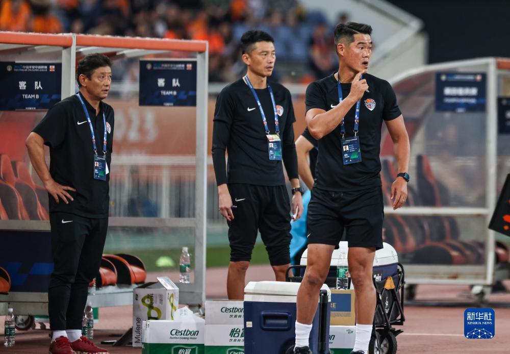 9月15日,青岛海牛队教练宿茂臻(右)在比赛中。新华社记者 朱峥 摄