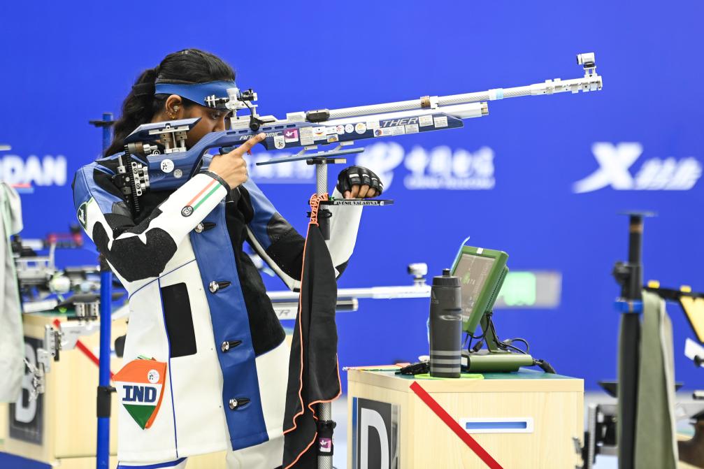 2023年7月29日,印度队选手瓦拉里万以252.5环的总成绩获得第31届世界大学生夏季运动会女子10米气步枪冠军。新华社记者 曹祎铭 摄