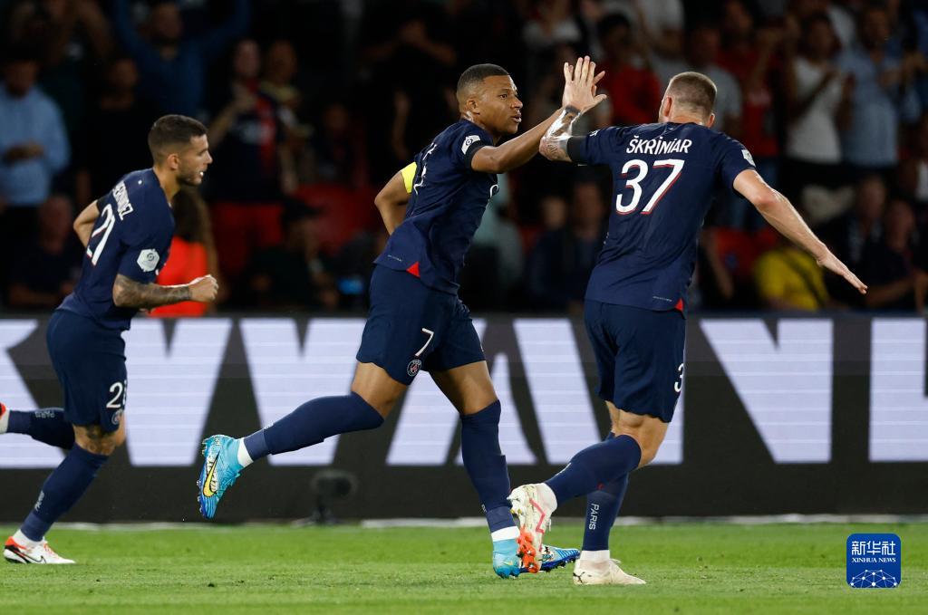 9月15日,巴黎圣日耳曼队球员姆巴佩(中)进球后庆祝。新华社/路透