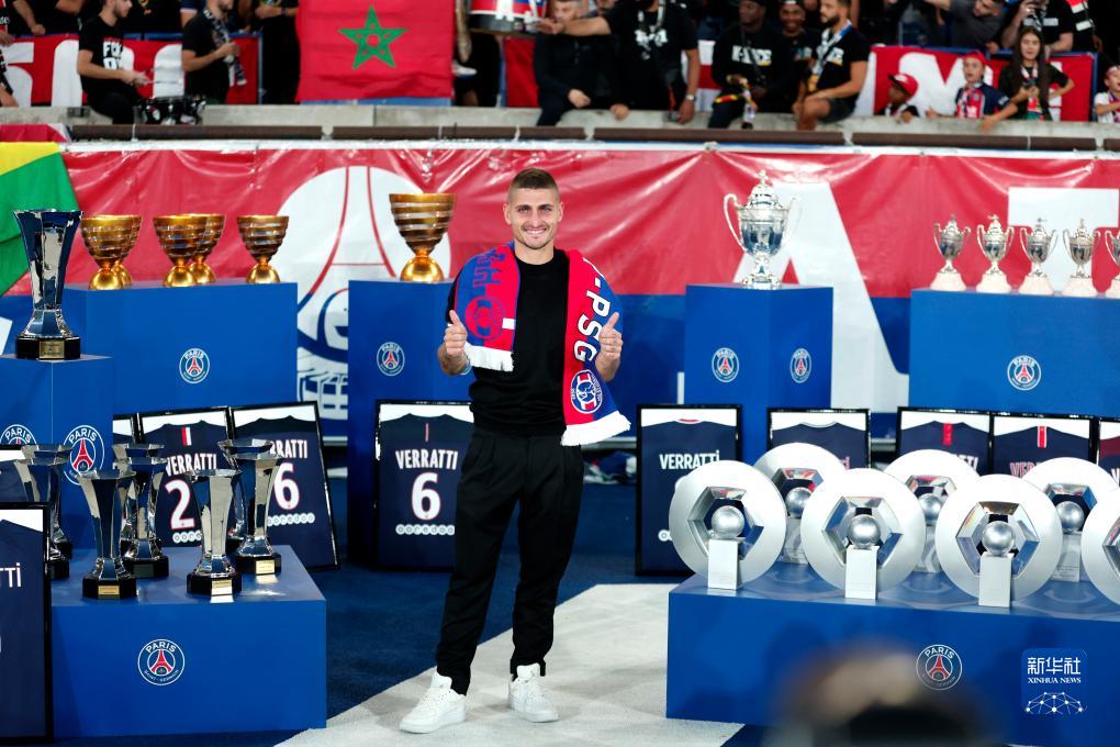 9月15日,前巴黎圣日耳曼队球员维拉蒂在赛前的告别仪式上与球队奖杯合影。维拉蒂在“大巴黎”效力11个赛季后,转会至卡塔尔阿尔阿拉比俱乐部。新华社/路透