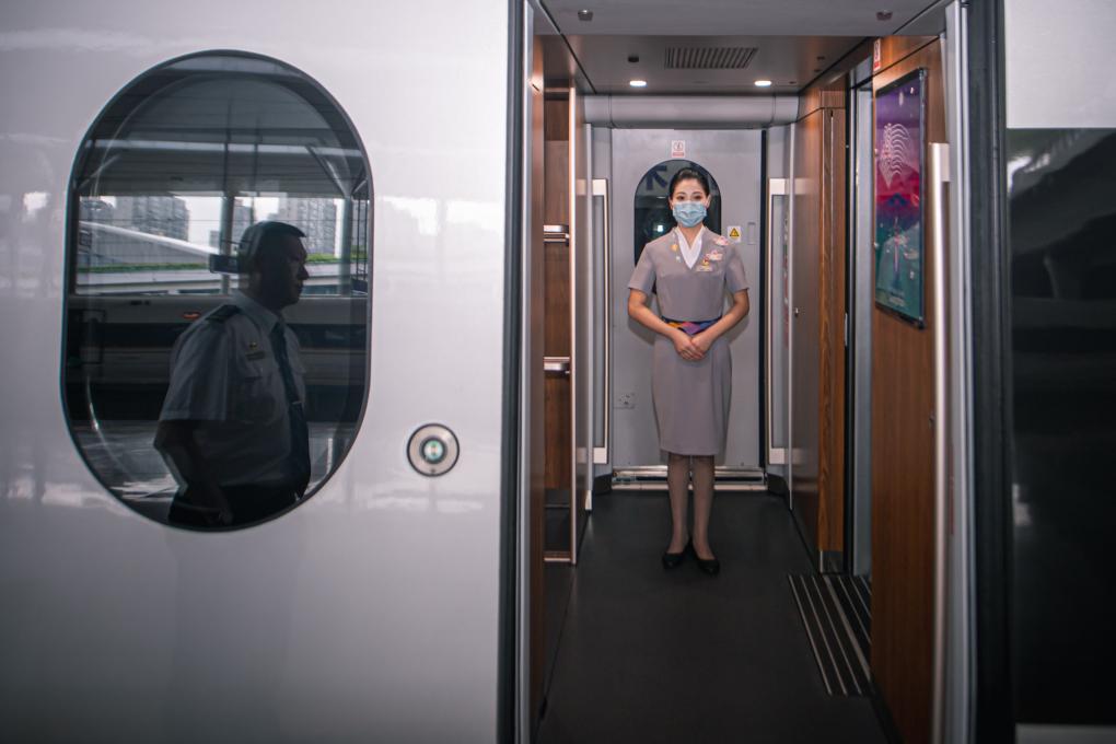9月16日,在杭州东站,乘务员在复兴号亚运智能动车组列车上准备迎接乘客。新华社记者 江汉 摄