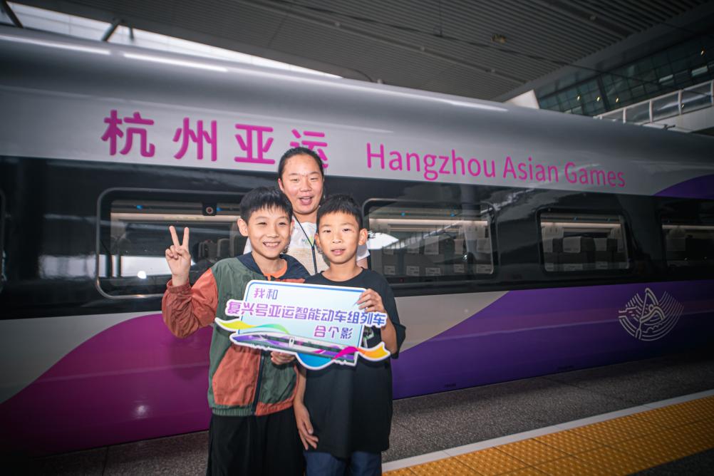 9月16日,在杭州东站站台,小乘客们与复兴号亚运智能动车组列车合影留念。新华社记者 江汉 摄