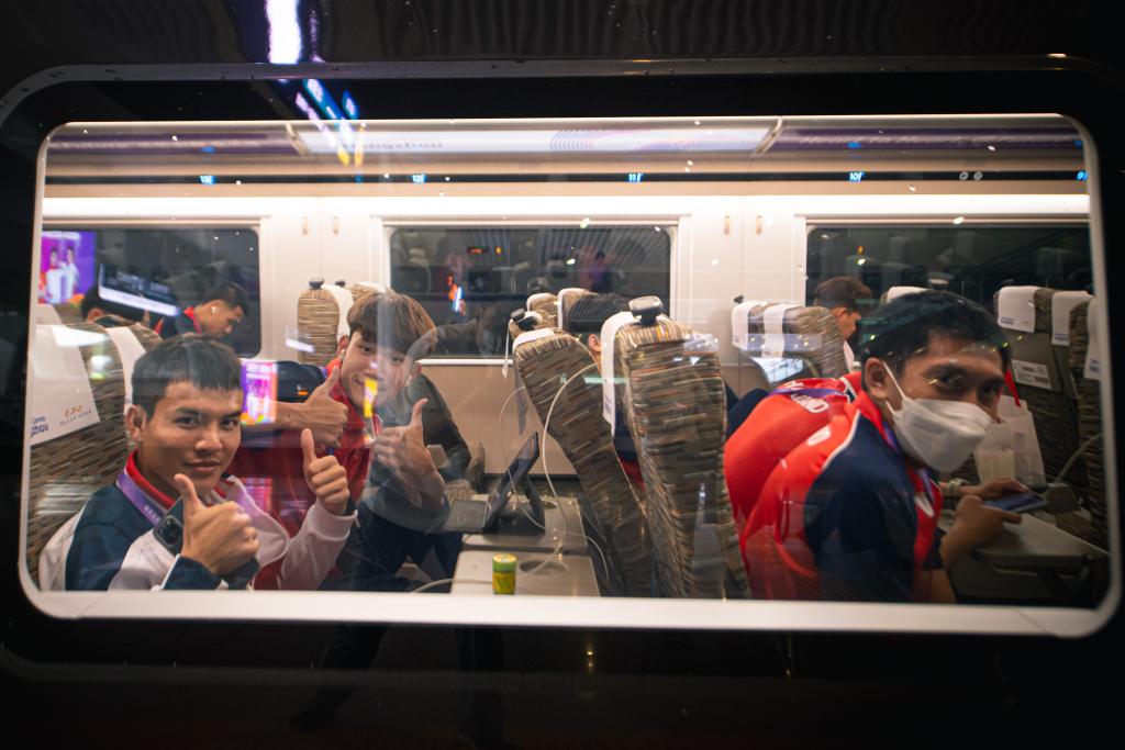 9月16日,泰国体育代表团成员乘坐复兴号亚运智能动车组列车前往金华赛区。新华社记者 江汉 摄