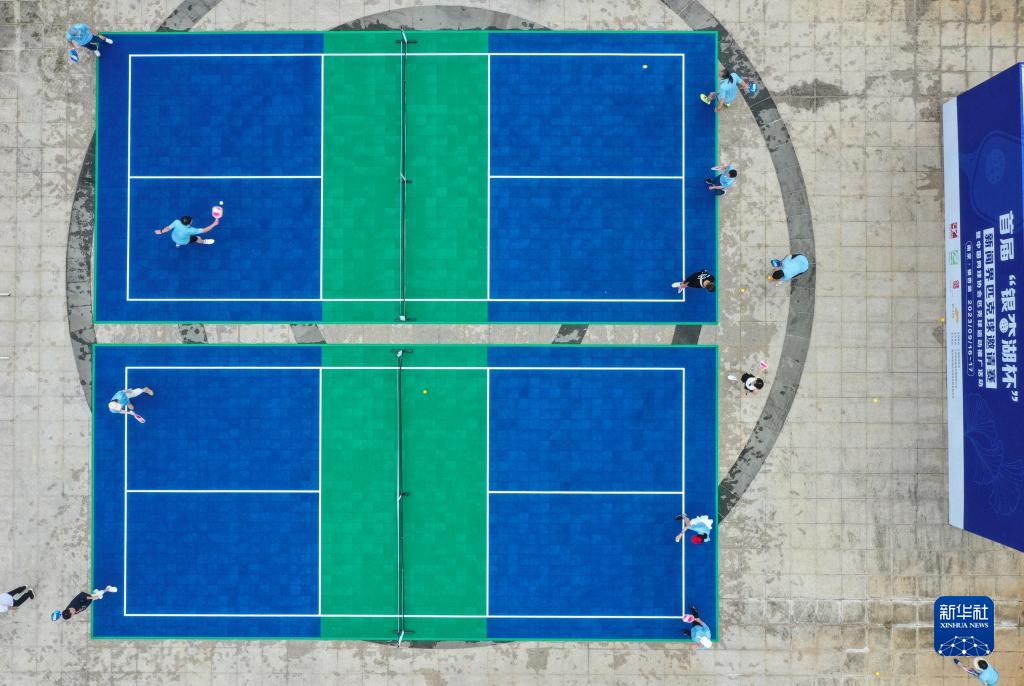9月16日,体验者在匹克球比赛场地练习(无人机照片)。新华社记者 杨磊 摄