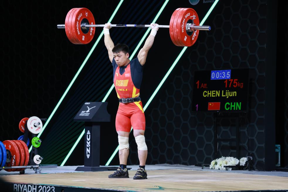 图为谌利军在2023年举重世锦赛男子67公斤级挺举比赛中。新华社记者 王海洲 摄