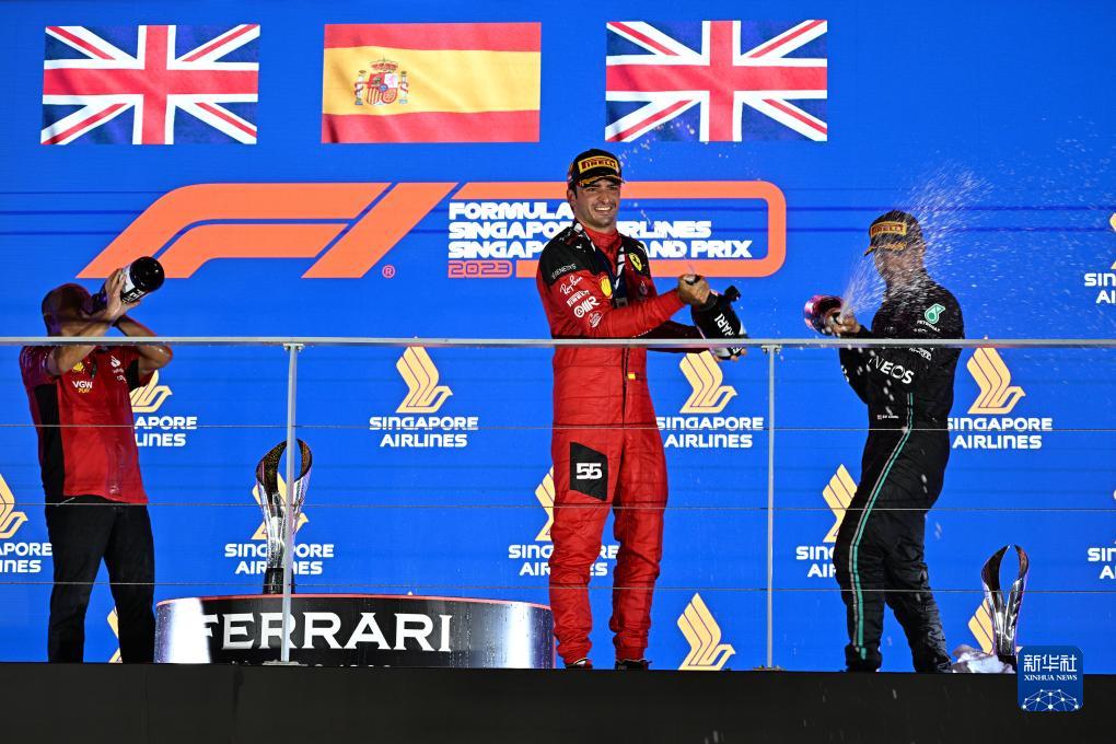 9月17日,法拉利车队西班牙车手塞恩斯(中)在颁奖仪式上庆祝。新华社发(邓智炜摄)