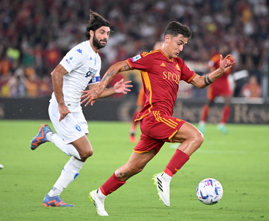 9月17日,罗马队球员迪巴拉(右)在比赛中突破。新华社发(阿尔贝托·林格利亚摄)