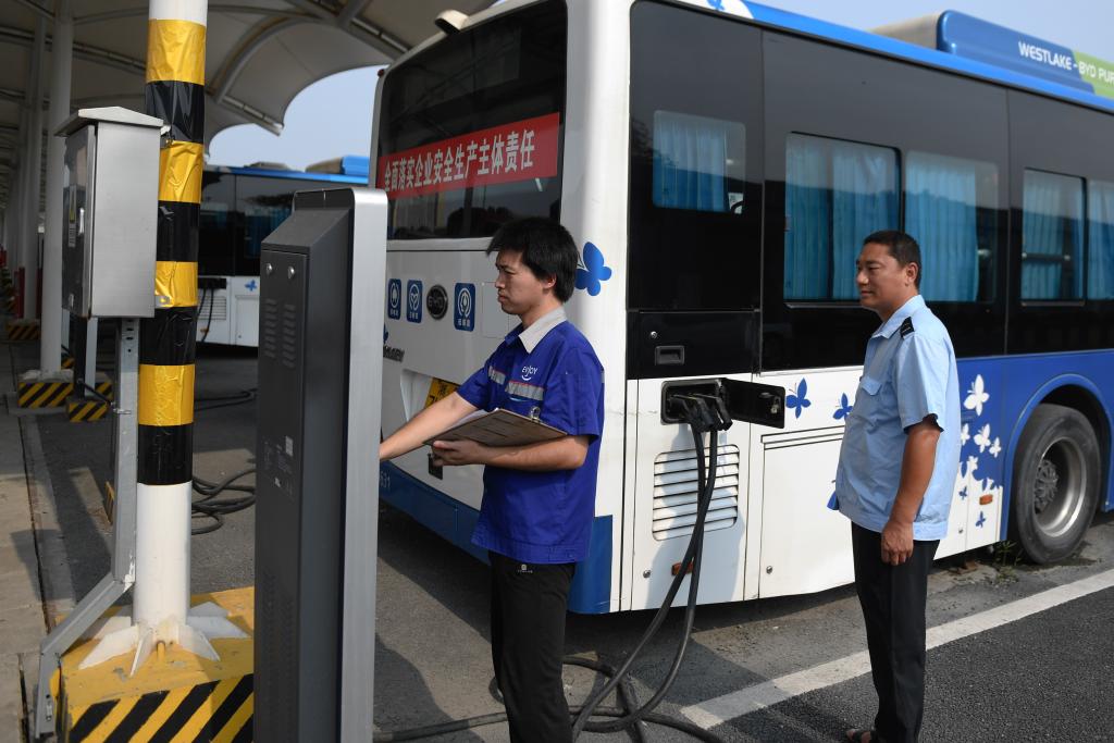 工作人员(左)在杭州公交电车公司拱康路维保站检查纯电动公交车的充电情况。新华社记者黄宗治 摄
